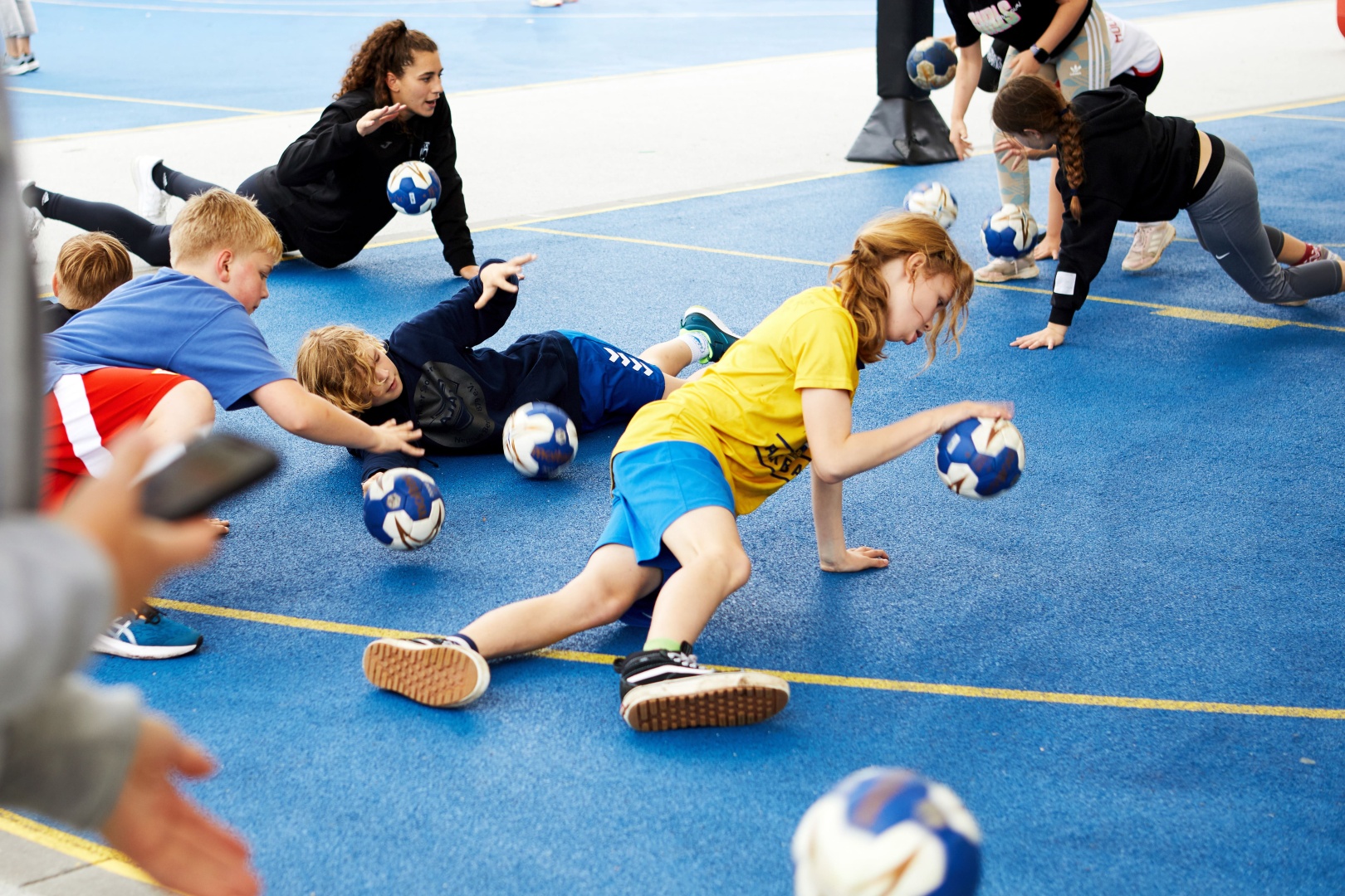 Auf dem Handballfeld leiten Spielerinnen des ersten Teams der Spreefüxxe Berlin die Kinder an. „Achtet mal drauf, dass der Arm schön weit oben ist beim Pass. Wir sind ja nicht beim Basketball“, sagt Kreisspielerin Kristina Fodie. Nach den ersten Übungen werfen die Kinder die Bälle auf Hütchen im Tor, genau an den Stellen, wo Torhüterinnen nicht so gut hinkommen. „Nach uns kommen noch andere Spielerinnen aus unserer Mannschaft“, sagt Kristinas Kollegin Leoni Bassiner, „damit möglichst viele einmal den Verein repräsentieren.“