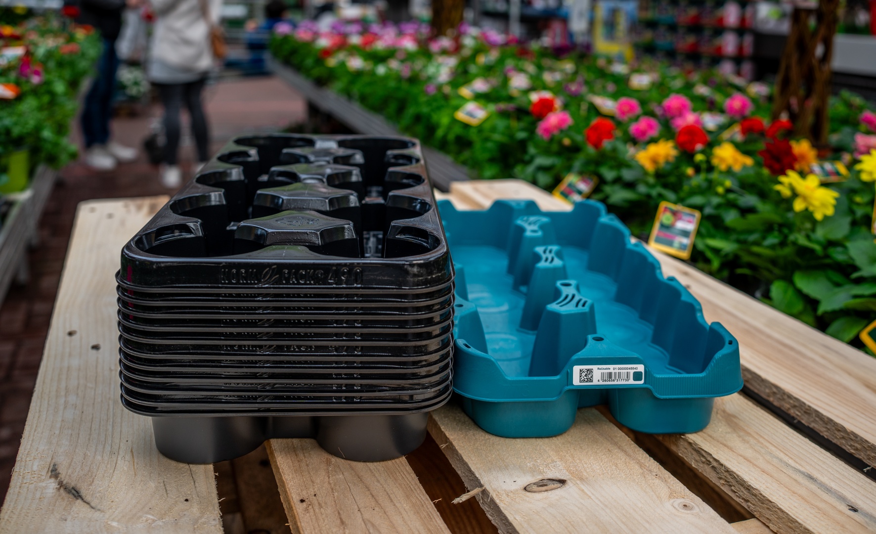 Das allein aber macht noch keine Kreislaufwirtschaft. Doch toom setzt an weiteren Stellen an – etwa bei Logistiklösungen. Mit dem System „Floritray“ ersetzt das Unternehmen klassische Einweg-Pflanzenpaletten durch eine Mehrwegalternative. Seit 2023 sind zusätzlich 300.000 Paletten im Umlauf, wodurch jährlich mehr als eine Million Einwegvarianten entfallen. Das entspricht einem Einsparpotenzial von über 200 Tonnen Kunststoff pro Jahr.