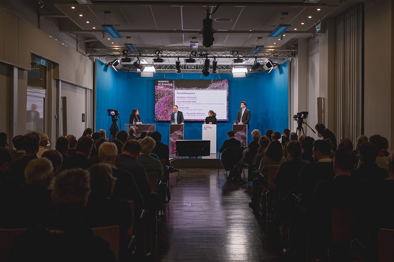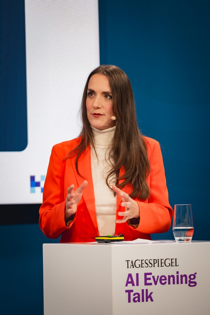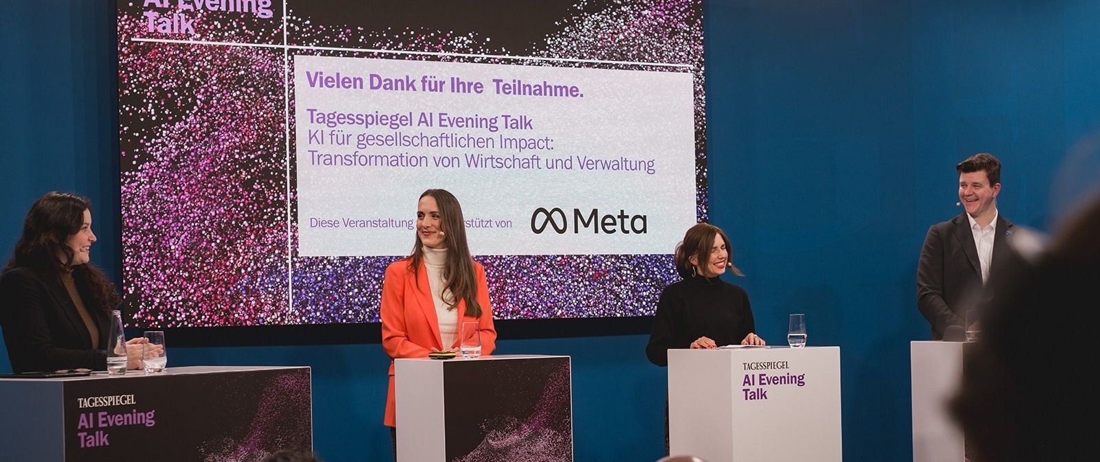 Tagesspiegel Background-Journalistin Alexandra Ketterer führte Christiane Germann, Amtfluencerin, amtzweinull, Henri Schmidt MdB, Mitglied im Ausschuss für Digitales und Staatsmodernisierung, CDU/CSU und Harmen Zell, Public Policy Manager, Meta durch eine Diskussion, die sowohl kritische Punkte als auch die großen Chancen von KI offen adressierte.